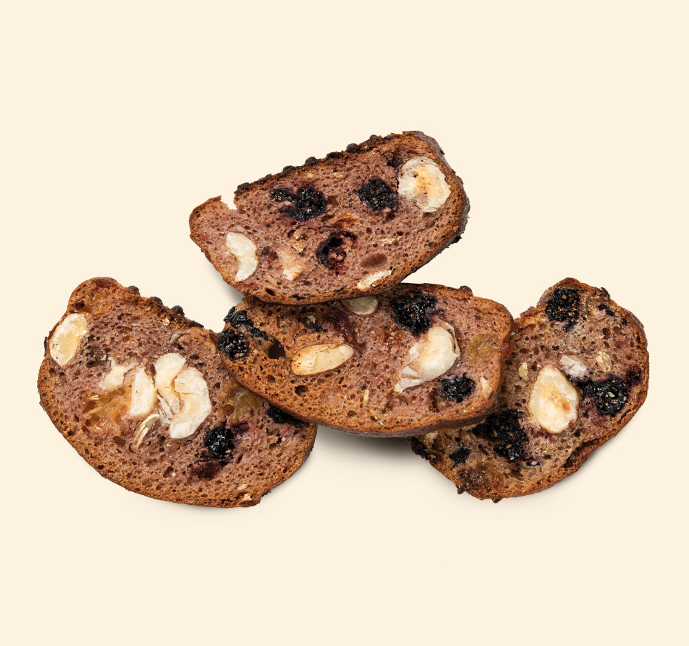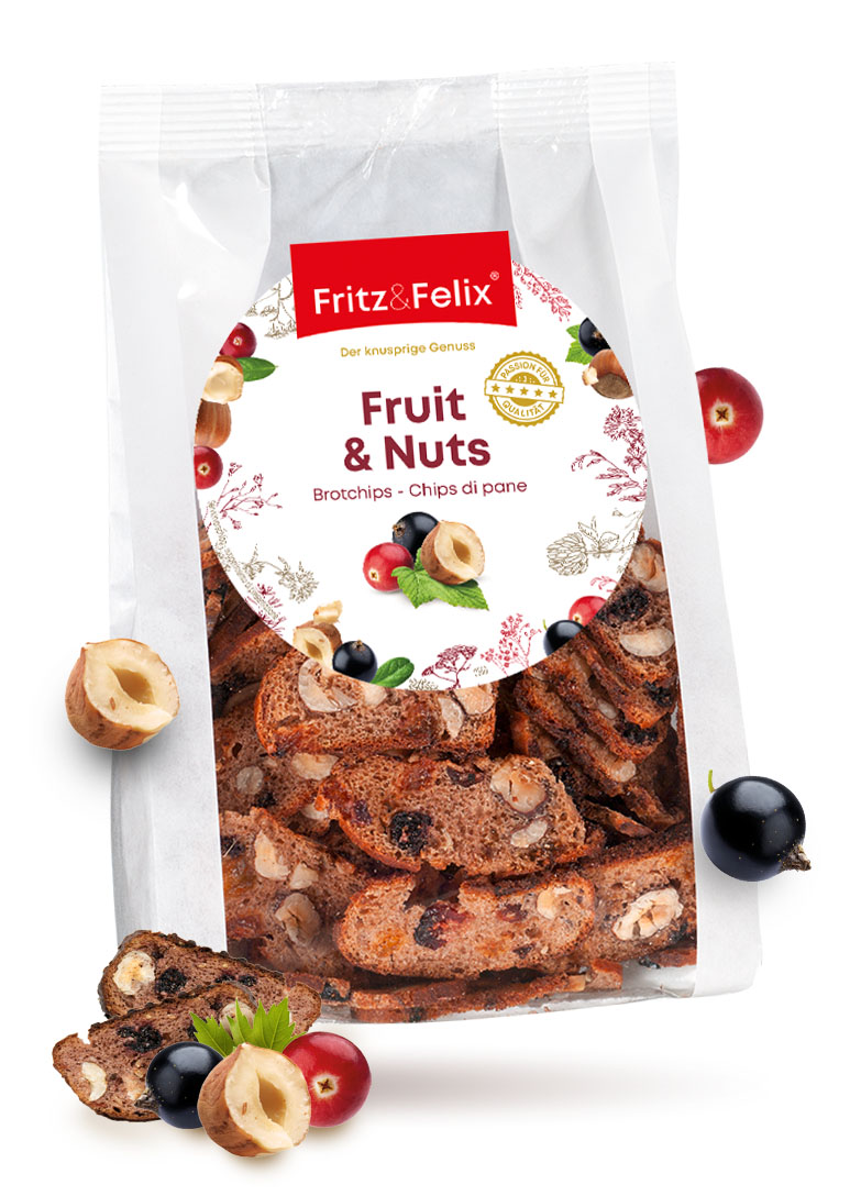 Un fantastico spuntino croccante! I Fruit & Nuts sono croccanti chips di pane con frutta secca e nocciole, inclusi ribes nero, mirtilli rossi e semi di finocchio. Tanti ingredienti salutari per uno snack sano, sempre a portata di mano!