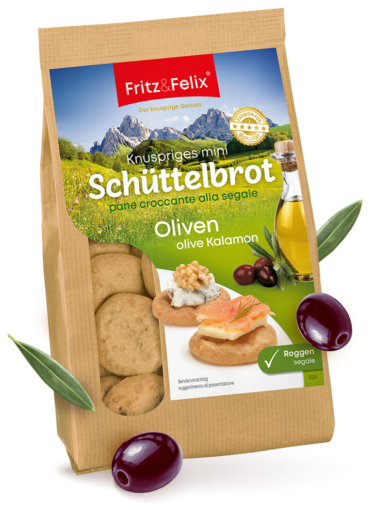 Olive in pezzi e un olio d’oliva selezionato arricchiscono questo Mini Schüttelbrot, rendendo il prodotto ancora più friabile, con uno speciale tocco mediterraneo.